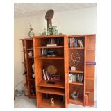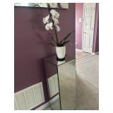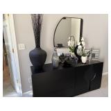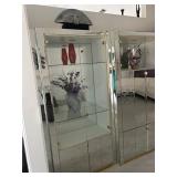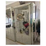 Living room furniture including three-piece mirrored wall unit with shelves and storage, remote controled lift chair with massage, large beautiful glass vases and decor, wall decor, display pedestals