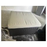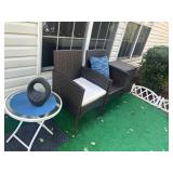Patio furniture including weather proof wicker settee, side chairs, storage box, metal patio table with glass top and six chairs