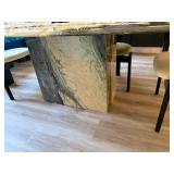 Dining room furniture including custom made marble dining table with center base and six Westnofa Totem chairs, custom made buffet and large post modern mirror with sculptural lacquered frame