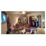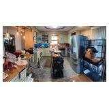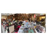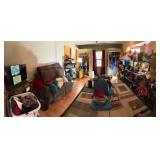 EMAMELWARE, CAST IRON YARD ART, BLOW MOLDS, CLOTHING, BEDDING, TVs, BOSE, VIKING & WHITE SEWING MACHINES, MASSAGE CHAIR, LIFT CHAIR, TABLE W. 10 CHAIRS