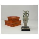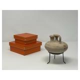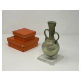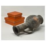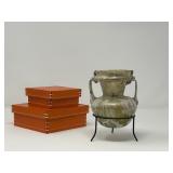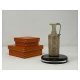 Welcome to The Bronze Age, the culmination of two remarkable Bostonian legacies, in Chestnut Hill. This sophisticated collection stands as an excavation, where each unearthed artifact offers a glimpse into the rich history and passions of its former owners. Find vessels from the Bronze Age to Judaica to decorative luxury items and SO much MORE! The Bronze Age is LIVE ONLINE at HuntEstateSales.com! #happyhunting LOCATION: VIRTUAL EVENT at HuntEstateSales.com SALE ENDS: Friday, 9/26 at 5PM COMPLIMENTARY LOADING: Saturday,9/27 from 10AM to 2PM PICKUP LOCATION: Allston, MA ** the address will be issued after a purchase is made** Need delivery? Shipping? Want to check it out in person before buying? No problem! Contact us at 617-817-1178 or info@huntestatesales.com Want First Dibs? Join the Hunt! SIGN UP for our MAILING LIST to get early access and exclusive coupon codes. Ancient earthenware can tell an archaeologist far more than just what people drank from it, it reveals insights into their technology, trade networks, and cultural exchange - - this sophisticated collection was like an excavation, where each item we unearthed offered a glimpse into the rich history and passions of its owners. So let the excavation begin! Find a collection of: Bronze Age earthenware Roman glass, with an iridescence, rainbow-like, metallic sheen on many Roman glass artifacts is not intentional but a result of natural aging. After centuries of being buried, chemical reactions caused by soil and moisture create mineralized layers on the surface that refract light. One of a kind sculptures that blend use of ancient Roman glass, sterling silver and gold by Israeli modernist jeweler and sculptor Uri Ramot. The 950 silver single Candelabrum with a roman glass decorated fluted column, on tripod stand made of roaring lions, with mounted 4th century C.E. oil lamps and roman glass. Additional standout pieces include: Picasso, Sujet Poisson, translates to Fish Subject, in earthenware clay. This pitcher, painted in black and white, exhibits a grinning smile that gives it an animated, even humorous quality. Edition of 500. Abstract painter Cleve Gray (1918-2004) was an American painter; the piece in this collection has a colorful yellow wash background with sweeping gestural brushstrokes that seemingly float above the surface. Ben Schonzeit, Aatlto White, Acrylic on Canvas, 1986. A pioneer in the SoHo art scene of the 1960s and one of the leaders of the American Photorealist movement of the 1970s, he is best known for his gorgeous still lives of flowers - large, arresting canvases – seen in this piece that depicts a bouquet, larger than life, while lilies, tulips, and carnations to eucalyptus leaves to a grey toned tiled backsplash. Teapot Fax Print by David Hockney (born 1937) 1988 Odd Job by Alan Shields (1944–2005). Alan was an American painter and mixed-media artist known for his brightly colored, unstretched, and three-dimensional textile works. His work is held in the collections of major institutions around the world; an edition of Odd Job is in the collection at The Metropolitan Museum of Art. Sorel Etroog (1933-2014), a Romanian-Canadian sculptor, painter and costume designer, began combining his monotone abstract-biomorphic bronze sculptures with technical-mechanic elements like screws and threads. Red enameled bronze, titled ‘Ballerina’. Seated Figure by John Kennedy (Burma/America, 1931-2004) 1994 Path to Self, Bronze Sculpture by Mirtala Bentov (1929-2017) 1987 Miguel Ángel Vidal (1928-2009) was a prominent Argentine artist. This piece is magnificent in person, it's difficult to show the layers of collage, as they become an optical illusion. Arbre (Tree), Oil on Canvas by Jean-Francois Larrieu (b. 1960) Original pastel drawings, from the Storm Scene Collection by Quebec-born abstractionist Rita Letendre. Connecticut artist, Gerald Drexler Garston captures you with his colorful baseball player at bat. "This earth, this time, this life are stranger than a dream" by Maggie Meredith, find an interior scene with a window looking out on the water with a collection of Duck Decoys. Elaine Thierry, a French painter and lithographer. Seen here is the pedestrianised street, which Parisians call “la Mouffe”, one of the oldest and picturesque streets of Paris. The Bronze age saw extensive trade, where vast international routes offered a connection to distant regions - this collection was gathered with the same devotion and curiosity as those adventurers. Featuring a collection of Chinese Export porcelain and enamels. A rare pair of Anhua decorated Yongle style bianhu moonflasks. These are expertly modeled with a flattened spherical body featuring two convex sides, supported by a rectangular foot and topped with a waisted neck and small bulb-shaped mouth. The body is intricately incised with lotus petals, radiating from a central medallion surrounded by a border and scrolling designs. Chinese Export Famille Jaune porcelain Chinese silver and coral double gourd snuff bottle Two headed rooster Chinese cloisonne censer 19th century Chinese lacquered and gilt sewing box And a Chinese Export lidded tureen and oval platter, with two headed eagle. Inscribed in Latin: BURC-CO_TYR 1820X, Archid Avst Dux, translates to Archduchess of Austria, Maria Theresa Duchess of Burgundy, Countess of Tyrol, 1820. Maria Theresa, was famous; the sole ruler of the Habsburg dominions from 1740 until her death. Her granddaughter, Maria Theresa of Austria-Este (1801–1855), held the Archduchess of Austria title in 1820. Pichhavai (Painting on Cloth) Annakut Festival of Nathdwara Temple in Rajasthan Furniture with a twist: From iconic pieces like: The Plia Chair (1967), a lightweight, folding plastic and steel chair by Giancarlo Piretti, it is considered a symbol of democratic design and is featured in the Museum of Modern Art (MoMA). The Drucker Café chair, where history is intertwined with the rise of the iconic French bistro chair, a 