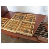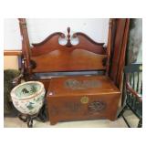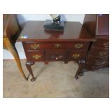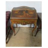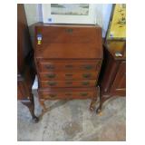 Biggs 10 drawer dresser; Drop front small desk with painted scene; Blanket box on Queen Anne legs; Small buffet with shell carving; Burgundy tufted executive leather sofa; Nice sideboard; Silver chest; Serpentine front secretary with bookcase top; Leather armchair; Chest with Oriental carvings; 4 poster beds; Drop side end table pair; Decorated tea cart; Early 3 drawer dresser; Bar stools; Needlepoint footstool; Side chair; Cane seat rocking chair; Hanging cabinet; Cane seat side chair;
