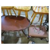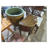 Half round table with decorated top & brass railing; Delicate small oval cabinet with metal escutcheons & brass railing; Large floor planter on stand; Large floor vase; Bamboo look chair set; End table pair; Oval coffee table; Bar seats; Floor candlestand; Small rocker; Marble top 2 drawer stand; Drop side table; Chocolate marble top Victorian table; Tray top table; End table; Nightstand; Love seat with 2 matching chairs; Kitchen clock; Pair of metal birds on tree limbs lamps;