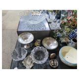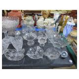 Waterford! Many pieces with boxes! Large console bowl; Large bowl; Small bowls; Stemware sets; Clock; Galle signed multi-layer butterfly artwork; Jade-ite mixing bowl set; Decanter; Colored glass pitcher; Mary Gregory style decorated vases; Punch bowl on stand with cups; Divided dishes; Paperweight; Baskets; Candlesticks; Ship’s decanter; Relish dishes; Bowls; Glass roses; Carnival glass bowl and much more!