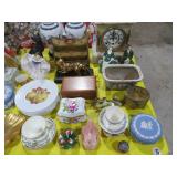 CHINA & GLASS: Lots of Oriental fishbowl planters in multiple colors & sizes; Blue & white floor vase; Native American pottery; Classical statue on Wedgwood base; Blue Onion dinnerware set; Royal Worcester Evesham egg coddlers; Lenox; Lots of blue & white pieces-pitchers, ginger jars, creamer & sugar set, teapots, bell S&P shakers, platters, more; Urn with golden finial; Blue willow serving bowls & more; Table full of figurines; Fine dinnerware sets; Delft canister set;