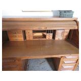 Early Empire style 4 drawer dresser with wood knobs; Beautiful buffet with nice veneer detailing; Painted blue bookcase/cabinet combo; Highboy; Drop front secretary; Golden oak serpentine front washstand; Victorian marble top side tables; Parlor set with love seat & chair; Contemporary Mission style bed & dresser; Another nice desk; Round dining table; White wicker sofa table; Shaving stand; Leather top table with drawer; Painted blanket box; Corner chairs; Hoop back chair; More blanket boxes; Small dresser with mirror;