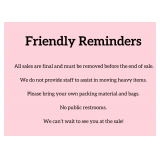 Please follow us on social media to get sneak peaks on our upcoming sales. We honor a watched list. Please line up in order of arrival. We elect the right to open early to help with crowd management. We accept cash and credit cards (credit card is a minimum of $20, and will be charged a 3% fee or $2, whichever is higher). Children are not permitted into the sales for their safety. Restrooms are not available to the public, we apologize for any inconvenience. Please bring help to carry out items. You are welcome to pay for large items and come back with appropriate help during sale hours. Thanks for reading the fine print. We appreciate you! |