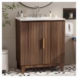 VINGLI 30Inch Walnut Fluted Bathroom Vanity with Ceramic Sink, 2-Door Cabinet, Mid-Century Modern Style, Perfect for Medium to Small Bathrooms (COMES IN 2 BOXES)