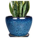8 Inch Ceramic Plant Pot, Ceramic Planter Pot for Indoor Outdoor Plants, Round Flower Pot with Drainage Hole and Saucer, Blue