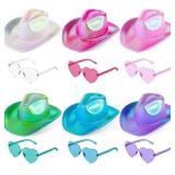 12 Pcs Holographic Space Cowgirl Hat with Rimless Sunglasses Neon Sparkly Cowboy Hat and Heart Sunglasses for Women