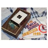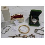 Selection of gold, sterling silver, gemstone & costume jewelry including gold rings; gold chains; gold bracelets; scrap gold; gold filled pieces; Victorian jewelry; men’s & women’s wrist & pocket watches-Tissot, Hamilton, Seiko, etc.; nice selection of Native American jewelry-cuff bracelets, turquoise, artist signed pieces, rings, earrings, etc.; Native American turquoise & sterling squash blossom necklace set; “Old Pawn” pieces; signed pieces: Crown Trifari, Hobe, Weiss, Kramer; old rhinestone brooches; lots of costume; etc.