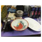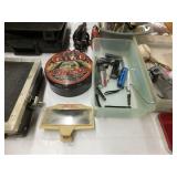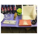 HOUSEHOLD: Tinkertoy Executive Office Kit – game Eastern Star Edition Heirloom Bible Legos Linens & Pillows DVDs Easels Clocks Purses Office Items Hat Boxes Framed “What is a Dad” Pictures Framed “Vermont Covered Bridges” CD’s Puzzles Showtime Rotisserie & BBQ Nesco Slow Cooker Handy Stitch NIB Picnic Basket Pink Berry Set Glass Bowls Gords Vases Toss & Go! One Pot Elite Gourmet Bread Maker Crock Pot Christmas Cookies Jar Campbell’s Cups & Mugs George Foreman Cooker Large Plate on Stand Lady Victoria Fine Crystal Vase Fancy Cake Stand Whale on Stand White Pheasant Duck Trays Doll Stands Hen on Nest Baking Pans Milk Glass Sailboat Pints Pyrex Covered Bowls Baskets Mallets Coin Operated Candy Machines Pint Fruit Jars (new and used) Pink Butterfly Plate Fruit Bowl Totes