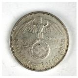1938 WW2 German Paul von Hindenburg 2 Reichsmark Silver Coin |