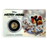 2017 NIEU $2 Mickey Mouse Little Whirlwind 0.5 Grams .999 Fine Gold Coin |