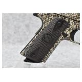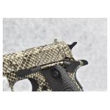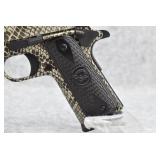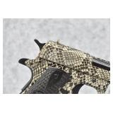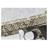 91R. Iver Johnson – Mod. 1911 A1 – 45 ACP Cal. Semi-Auto Pistol – w/5” Barrel w/Blade Front and Iron Rear Sights – Copperhead Snakeskin Finish – w/Textured Black Wood Grip w/Iver Johnson Logo – w/Dovetail Safety – w/Manual Thumb Safety – As New w/Factory Hard Case, Lock, and Factory Magazine