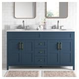 This freestanding double vanity gives you a spacious spot in your bathroom to get ready for the day. It has a crisp, modern silhouette and a clean-lined base crafted from engineered wood. Three central drawers and two cabinets, each with a set of double doors, provide ample room for towels and toiletries. The white stone countertop measures 59.5" wide and includes two oval undermount sinks, and faucets sold separately. Bonus: This vanity arrives fully assembled with two openings in the back for hassle-free installation.