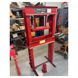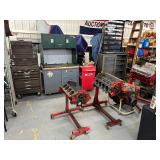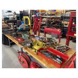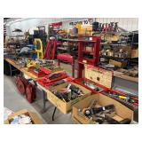 Shop Equipment & Machinery- Equipment incl. Black & Decker Band Saw, Craftsman Band Saw, Craftsman Scroll Saw, Performance Tool Drill Press, Craftsman Sander/Grinder, Makita Circular Saw, Reelcraft air hoses, Table Saw, floor jacks, Sunex Tools 20-Ton Hydraulic Shop Press, Central Machinery Metal Brake, 2-Ton Folding Hydraulic Engine Hoist, Central Machinery English Wheel Kit with Stand, Fastenal storage shelving, kerosene forced-air heater, dollies, torch setup, Stack-On storage locker, jack stands, heavy-duty lamps, gas tanks, ladders, industrial metal display cabinet, standing toolboxes with wheels, rolling tool carts, wall-mounted tool racks, tool chests, and more.