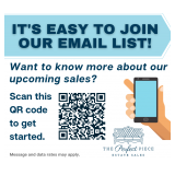 1. CASH and ALL MAJOR CREDIT CARDS will be accepted. There is a 3% CONVENIENCE FEE for all CC. Please NO checks! 2. PLEASE BRING BAGS AND BOXES TO PACK YOUR PURCHASED ITEMS. 3. ALL FURNISHINGS MUST BE REMOVED BY THE FINAL DAY OF THE SALE. NO EXCEPTIONS! 4. All Sales are "FINAL" and "AS IS". 5. It is your RESPONSIBILITY to check your merchandise for damage, scratches etc. ANY damage that we notice is on the sales tag. Terms and Conditions: 6. You MUST bring help to load large items. WE CANNOT HELP LOAD FURNITURE. 7. Please DO NOT call for pricing and we DO NOT presell. 8. Some exclusions may apply to daily discount. 9. We DO NOT discount fine jewelry or precious metals. Thank you for your cooperation. |
