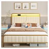 Lot - 19 Rolanstar Full Size Bed Frame with LED Light and Charging Station, Upholstered Headboard and Footboard, Metal Slat, Noise Free, Easy Assembly, Golden