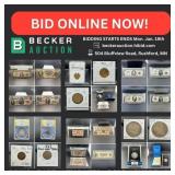 Auction Location: 504 Bluffview Road, Rushford, MN 55971 1 Starts Closing Monday, January 19th @ 7 P.m. Starts Closing Monday, January 19th @ 7 P.m.a Credit/debit Card Will Be Required To Bid. We Will Not Charge Your Card If Your Winning Items Are Picked Up Within The Pick-up Dates Or Other Arrangements Are Made. If You Have Items That Have Been Here F... 1 Inspection Dates: By Appointment. You Are Encourag Inspection Dates: By Appointment. You are encouraged to join our inspection days. NO REFUNDS OR RETURNS on items. It's the buyer's responsibility to check item(s) for completeness, condition, and working condition. Please understand these terms or do 1 Pick-up, Tuesday, January 20th: 9 A.m.-5 P.m. Onl Pick-Up, Tuesday, January 20th: 9 a.m.-5 p.m. Only! Location: 504 Bluffview Drive, Rushford, MN 55971 1 Payment: Cash, Credit/debit Card Or Good Check (wi Payment: Cash, Credit/Debit Card or Good Check (with a positive I.D.) payable to Becker Auction paid on pick up day before removing merchandise. Premium: 15% Buyer Fee added to your items unless otherwise stated. 5% discount on cash and check purchas 1 Shipping Available. Heavy & Bulky Items Can Get Ex Shipping Available. Heavy & Bulky Items Can Get Expensive! Please Keep This In Mind While Bidding! Local Pick-up Preferred 1 Auction Location: 504 Bluffview Road, Rushford, Mn Auction Location: 504 Bluffview Road, Rushford, Mn 55971 1 Please Watch Your Quantities - Make Sure You Know PLEASE watch your quantities - make sure you know if it is TIMES the money or if you are bidding on ONE lot 1 Login Issues- Call 844.775.4774 Login Issues- Call 844.775.4774 370 Rare 1875-s/s Twenty Cent Silver Piece, Anacs Au50 Rare 1875-s/s Twenty Cent Silver Piece, Anacs Au50. Rotated Die. Fs-2302, Mpd-001. 370 1875-s Silver Twenty Cent Piece 1875-S Silver Twenty Cent Piece 370 1834-cc Capped Bust Silver Quarter 1834-cc Capped Bust Silver Quarter 370 1876-cc Seated Liberty Silver Quarter, Holed, Key 1876-cc Seated Liberty Silver Quarter, Holed, Key 370 1877-cc Seated Liberty Silver Quarter 1877-cc Seated Liberty Silver Quarter 370 1818 Capped Bust Silver Quarter 1818 Capped Bust Silver Quarter 370 1830 Love Token Capped Bust Dime 1830 Love Token Capped Bust Dime 371 1864 Indian Head Cent, Key Date. 1864 Indian Head Cent, key date. 372 1871 Indian Head Cent, Key Date, Higher Grade, Ful 1871 Indian Head Cent, key date, higher grade, full Liberty, strong detail. 373 1877 Indian Head Cent, Key Date, Anacs Good Detail 1877 Indian Head Cent, key date, ANACS Good Details. 374 1878-cc Morgan Silver Dollar. 1878-CC Morgan Silver Dollar. 375 1879-cc Morgan Silver Dollar. 1879-cc Morgan Silver Dollar. 376 1890-cc Morgan Silver Dollar. 1890-CC Morgan Silver Dollar. 377 1882-cc Gsa Morgan Silver Dollar, No Box Or Paperw 1882-CC GSA Morgan Silver Dollar, no box or paperwork. 378 1882-cc Gsa Morgan Silver Dollar, No Box Or Paperw 1882-CC GSA Morgan Silver Dollar, no box or paperwork. 379 1883-cc Gsa Morgan Silver Dollar, Ngc Ms63., No Pa 1883-CC GSA Morgan Silver Dollar, NGC MS63., no paperwork or box 380 1883-cc Gsa Morgan Silver Dollar, No Box Or Paperw 1883-CC GSA Morgan Silver Dollar, no box or paperwork. 381 1884-cc Gsa Morgan Silver Dollar, No Box Or Paperw 1884-CC GSA Morgan Silver Dollar, no box or paperwork. 382 1883-cc Gsa Morgan Silver Dollar, No Box Or Paperw 1883-CC GSA Morgan Silver Dollar, no box or paperwork. 383 1884-cc Gsa Morgan Silver Dollar, No Box Or Paperw 1884-CC GSA Morgan Silver Dollar, no box or paperwork. 384 1884-cc Gsa Morgan Silver Dollar, No Box Or Paperw 1884-CC GSA Morgan Silver Dollar, no box or paperwork. 385 1884-cc Gsa Morgan Silver Dollar, With Box And Pap 1884-cc Gsa Morgan Silver Dollar, With Box And Paperwork. 385 1899 Morgan Silver Dollar, Only 330,000 Minted 1899 Morgan Silver Dollar, Only 330,000 Minted 386 1895-o Pcgs Xf45 Morgan Silver Dollar, 450k Minted 1895-o Pcgs Xf45 Morgan Silver Dollar, Only 450k Minted, Key Date 387 1895-s Pcgs Vf30 Morgan Silver Dollar, 400k Minted 1895-s Pcgs Vf30 Morgan Silver Dollar, Only 400k Minted, Key Date, Pcgs Gold Sheild 388 1966-a $100 Red Seal United States Note. Serial Nu 1966-A $100 Red Seal United States Note. Serial number A00867078A. 389 1928 $1 Red Seal United States Note, Puerto Rico I 1928 $1 Red Seal United States Note, Puerto Rico Issue. Serial Number A01741547a. 390 (2) Consecutive 1864 $10 Confederate States Of Ame (2) Consecutive 1864 $10 Confederate States of America Notes, Choice UNC 63 EPQ. 391 1863 50-cent Confederate States Of America Note, C 1863 50-cent Confederate States Of America Note, Choice Unc 63. 391 1864 50 Cent Confederate States Of America Note 1864 50 Cent Confederate States Of America Note Currency. T-72. Serial Number: 94750. Plate: E. Very Choice New 64. 392 Rare 1864 $100 Confederate States Of America Note, Rare 1864 $100 Confederate States Of America Note, Richmond Issue. 393 1917 $1 Horse Blanket Red Seal Legal Tender Note. 1917 $1 Horse Blanket Red Seal Legal Tender Note. Serial Number A76500973a 394 1899 $1 Black Eagle Silver Certificate. Serial Num 1899 $1 Black Eagle Silver Certificate. Serial number T67341133A. 395 1917 $2 Legal Tender Bracelet Back Large Note. Ser 1917 $2 Legal Tender Bracelet Back Large Note. Serial number O53145997A. 396 1914 $1 Green Eagle National Currency Note, Philad 1914 $1 Green Eagle National Currency Note, Philadelphia. 397 (5) 1935 $1 Silver Certificates, No Motto. (5) 1935 $1 Silver Certificates, No Motto. 398 1935 $1 Silver Certificate Star Note, No Motto, Cr 1935 $1 Silver Certificate Star Note, No Motto, crisp. 399 1934-a $10 Hawaii Note. Silver Certificate 1934-A $10 Hawaii Note. Silver Certificate 400 1899 $5 Silver Certificate � Indian Chief Note 1899 $5 Silver Certificate � Indian Chief. Note Fr-281. Spielman / White Signatures. Serial Number: N69932302. Plate Number: F149 / 72. Pcgs Fine 12 Graded. 401 1886 $1 Silver Certificate � Martha Washington. Un 1886 $1 Silver Certificate � Martha Washington. 
