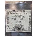 1792 French Assignat, Quinze Sols Note |