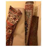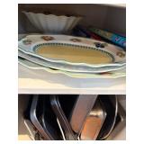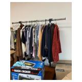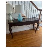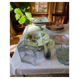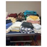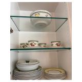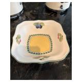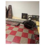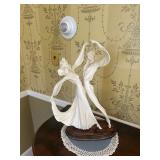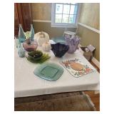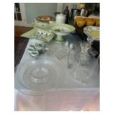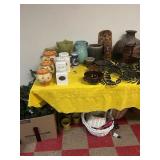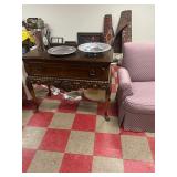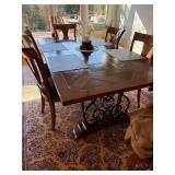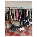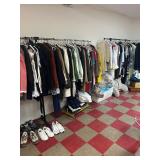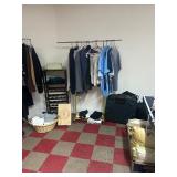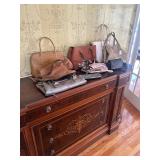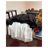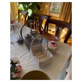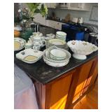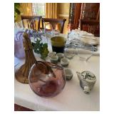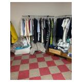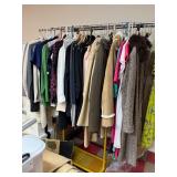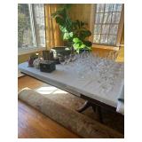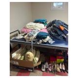 Grange dining table with 6 chairs, Grange burled sideboard, mahogany console table, pair of mahogany leather top round side tables, carved sideboard, plaid upholstered arm chair, assorted side tables, lamps, giltwood sun mirror, Maitland Smith gilt mirror, rugs & runners, beautiful bronze chandelier, bedroom furniture, Santini Tango Dancers sculpture, Villeroy & Boch French Garden china and lots of serving pieces, crystal stemware, art glass, pottery, baskets, serving pieces, table linens, decorative accent pieces, art, Christmas, books, hurricane lamps, kitware, marbled espresso set, lots of designer clothes, shoes, bags & accessories, vintage Singers, garage items and lots more! |