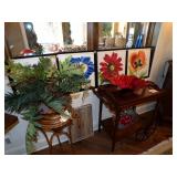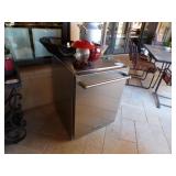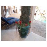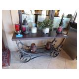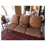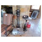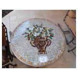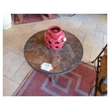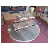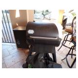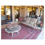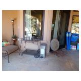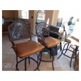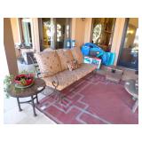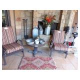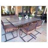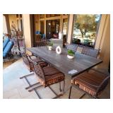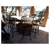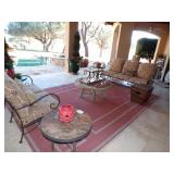 PATIO: (HIGH END) Custom Wrought Iron/Wood Patio Table/6 Chairs; Wrought Iron Glider Sofa & End Tables; (8) Wrought Iron Bar Stools; (3) Wrought Iron/Slate Side Tables; (2) Wrought Iron Patio Chairs/Ottomans; Wrought Iron Tea Cart; (2) Chase Loungers; Wood Patio Ice Chest; Patio Bar Fridge; Custom Tile Patio Round Table; Traeger Pellet Grill; Ceramic Planters; Outdoor Area Rugs; Pool Floats & Storage Rack.