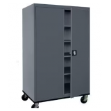 - The Sandusky mobile welded steel storage cabinet is suitable for organizing, storing, transporting, and securing your valuable items. The cabinet features four adjustable shelves and one fixed bottom shelf to accommodate various storage needs. It includes a recessed handle with three-point locking systems to secure the cabinet.