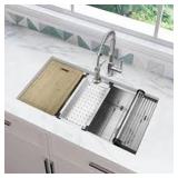This single ledge workstation sink forged from 16-Gauge Type 304 corrosion resistant stainless steel includes sliding accessories for multi-tasking and additional counter-top space. Slide the colander next to the cutting board and easily spray off fruits and veggies before or after cutting. Equipped with practical accessories to decrease food prep time and a bottom grid to protect the bottom surface and prevent scratching. The workstation sink comes in a standard 36 in. by 22 in. size for most existing cut-out. If you enjoy cooking like a professional chef then this is the sink for you.