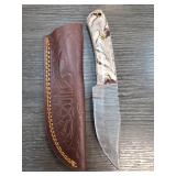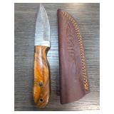Knife with Damascus Blade and Leather Sheath |