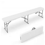 Quality and Sturdy: The white table top is made by HDPE, solid and enough thick. The strong frame is with gray coated, beautiful as well as stable Easy to Take and Store: The overall size of this rectangular table is 72*30*29 inches (L*W*H). It can be easily folded into a compact case measuring 36*30 inches, making it incredibly convenient to store and carry. With its efficient storage design, it maximizes space utilization, allowing you to make the most of your available space Lock Design: The maximum weight capacity of this table is up to 350lbs. It is designed with a lock on the support rod and tabletop to prevent folding when open, ensuring safety during use