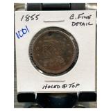 1855 Large Cent Holed Coin with Fine Detail |