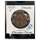1950-S Lincoln Wheat Penny with Rainbow Color |