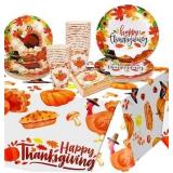 HOWAF 97Pcs Happy Thanksgiving Party Supplies Disposable Dinnerware, Turkey Maple Leaf Themed Plate, Cup, Napkin, Cutlery, Tablecloth for Thanksgiving Table Decoration Tableware, Serves 24 Guests