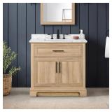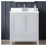 - The cultured marble sink top also includes an integrated rectangular white sink that's offset to the left, providing open counter space on the right. Created with convenience in mind, this pre-assembled bathroom vanity features an open-back design, 6-way adjustable hinges, adjustable drawer fronts, a