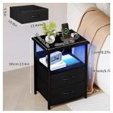 Fixwal Night Stand with Charging Station, LED Nightstand with U-S-B Ports and Outlets, 2 Fabric Storage Drawers with PU Finish, Small Bedside Table, Black