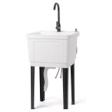 ROVSUN 21-Gallon Plastic Utility Sink, Freestanding Sink with Hot&Cold Faucet, Soap Dispenser, Drain Plug and Iron Legs, Perfect for Laundry Room, Garage, White, 19.7L"×18.9W"×33.1H"