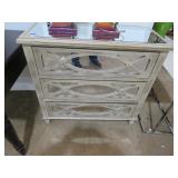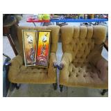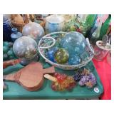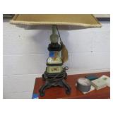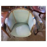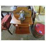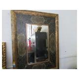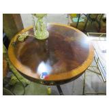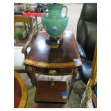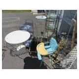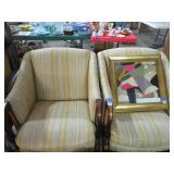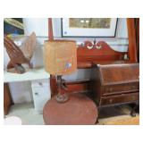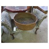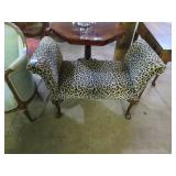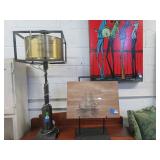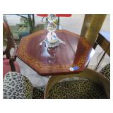 Really unusual corner hanging curio cabinet; Small chest of drawers; Octagonal table with leaf decoration; Leopard print bench; Upholstered club chair; Round gateleg table; Shaving mirror with 2 drawers; Nice pairs of upholstered chairs; Contemporary chest of drawers; Padded stools; Unusual lamp with metal base and pierced brass shade in box frame; Pair of table lamps with circular brass bases; Preening peacock base lamps; Filigree panels; Stacked glass orb lamp; Tea caddy; Medallion inlaid knife box & flatware; Lots of decorator accessories; Bedside parlor lamp;