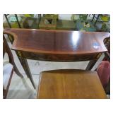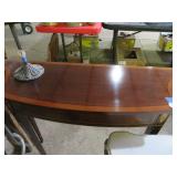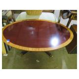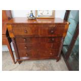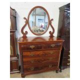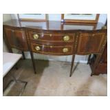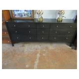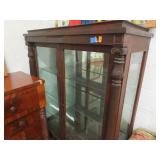 Beautiful double wide glass shelf curio cabinet; Room and Board ‘Calvin’ 9 drawer dresser; Empire dresser with turned columns; Large buffet; Glass top dinette table with 2 leather chairs; Mirrored surface 3 drawer chest; Banded edge brass footed oval coffee table; Dining table with leaf and 8 chairs; Bar seats; Islamic style framed wall mirror; Drop side table; Footstool;