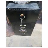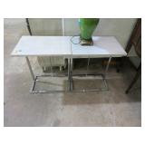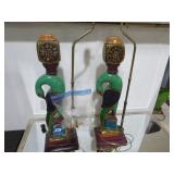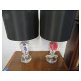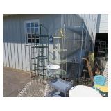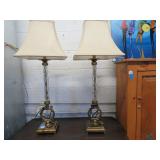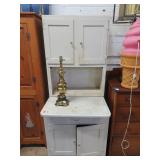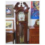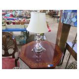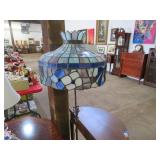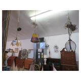 Fascinating pair of faceted crystal table lamps; Tiffany style leaded glass shade floor lamp; White painted Hoosier style cabinet with enamel worktop; Tole painted cabinet with top railing; Grandfather clock; Chrome base side tables; Large ceramic urn table lamp; Executive office chair; Wicker trunk; Large brass circular tray; Wall mirror in fancy gold frame; Small desk; Eagle topped bullseye mirror; Copper table lamp with copper shade; Leaded glass shade mini lamp & more!