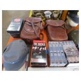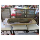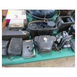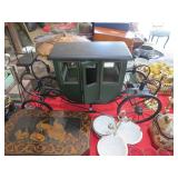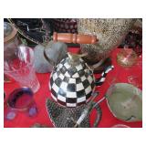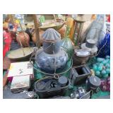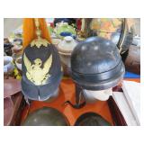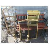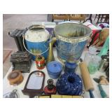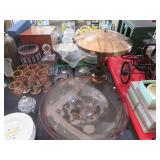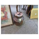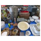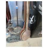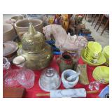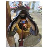 MORE: WWII German army saddle with saddle bags on stand (per consignor); Brass & glass inkwell desk set; Mantel clock; Visible working brass & glass clock; Large dough bowl; Copper milk can; Long handled pizza peels; Long handled cook pan; Checkered tea kettle; Brass candleholder; Sweetgrass basket of napkin rings; Peacock decorated box; Stretched coke bottle; Brass fox door knocker; Steins; Ceramic pig bank;