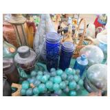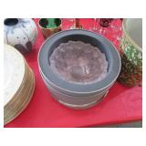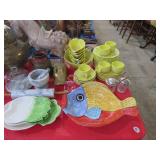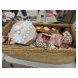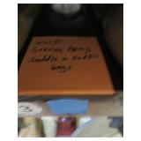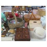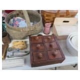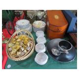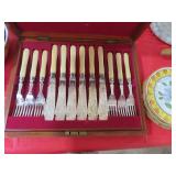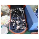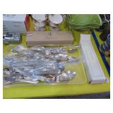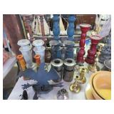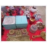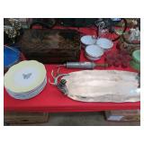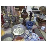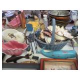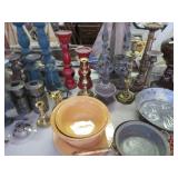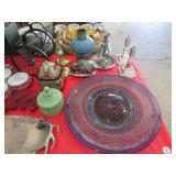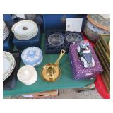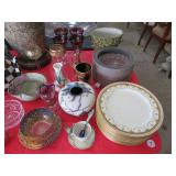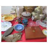 Elegant fish knife & fork set with bone handles in case-fish etching on all pieces; Silver tray; Silver topped S&P shakers; Candlestick; Flatware in knife case; Candlesticks; Pewter candleholder; Rabbit; Brass candlesticks; Serving platter with antler & pinecone handles; Basket with blue glass insert; Williamsburg pieces in boxes; Silver rim pitcher; Mayonnaise bowl with silver top & Much more!