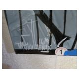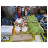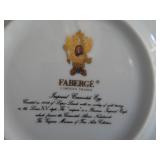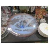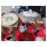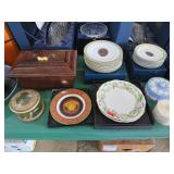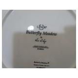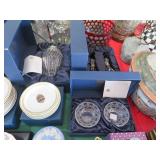 CHINA & GLASS: Butterfly decorated cup, saucer & spoon; Faberge plates in boxes; Versace plate; Lenox birds plates; Fruit finial lidded tureen with hand-painted scene; Bulbous butterfly decorated bud vase; Metallic look vase; Trinket box; Studio pottery; Champagne bucket; Gold rimmed plates; Wedgwood jasperware; Fine dinnerware plates; Bunny plates; Triple condiment server; Tureens; Lenox “Butterfly Meadow” plates; Large Mercury glass vase; Etched centerpiece art glass bowl signed Vanderlaan & Bliss 11/84; Fish platter; Cabbage dishes; Fairing; Hunt scene trinket box;