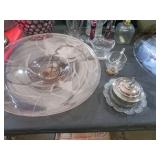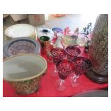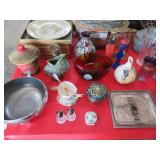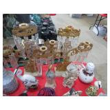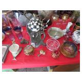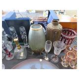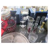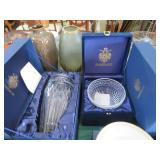 Boxed Faberge crystal vase, bowls & more; Tiffany bowls in boxes; Waterford vase; Luster lamp with prisms; Art glass vase; Colored cut to clear flutes; Beautiful ruby vase with gold embellishments; Emerald vase with gold & enamel decorations; Lots of decorated & enameled glassware; Footed clear powder jar with white enamel flowers; Jade-ite covered candy bowl; Large art glass bowl; Decanters; Trinket boxes; Goblets; Crystal candlesticks; Ruby cut to clear large bowl; Bud vases; Mayonnaise bowl with underplate & silver top; Creamer & sugar; Blush Sunday Rose bowl; Silver top condiment duo and much more!
