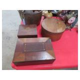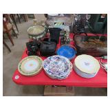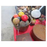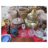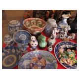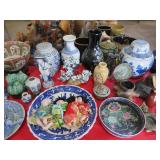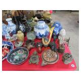 Lots of chinoiserie & Japanese items; Samurai helmet miniature; Ginger jars; Bowls; Plates; Dolls; Incense burner; Pen rack on bell; Vases & ceramics; Tree model; Ashtray; Blue & white pottery; Large brass censer; Brass bucket of croquet balls; Wooden cheese box;