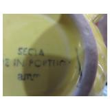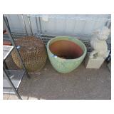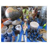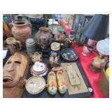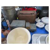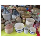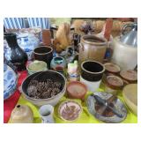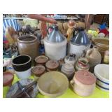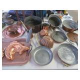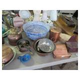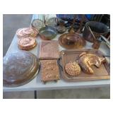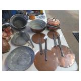 Copper fold molds; Old copper sieve; Copper pitcher; Copper tray; Copper cookware; Candlestick mold; Stoneware jugs; Crocks; Stoneware pitcher; Butter crocks with blue bands; Yellow ware mixing bowl; Dark glazed crock; Iron kettle with handle; Marble rolling pin; Marble mortar & pestle; Marble cheese keeper with glass dome; Brass keys; Wooden shoes; Masks; Wooden boxes;