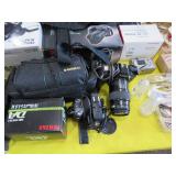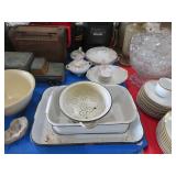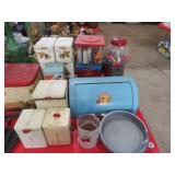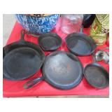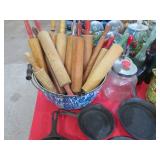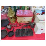 Cast iron skillets & griddle including Griswold; Cornstick pan; Food grinders; Blue swirl granite ware kettle full of rolling pins; Mayonnaise mixer; Cookie canister; Empeco bread box; Old Woman who lived in a shoe cookie jar; Enamelware canister set; Bubblegum dispensers; Apple decorated flour sifter; Gray granite ware pie plates; Large toy carriage; Collectible snow globe; Minolta cameras & accessories; Lighted 3D strawberry ice cream cone display; Much Much More!!!