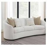 Bring inviting sophistication to your space with this contemporary curved sofa, featuring a soft latte boucle fabric that highlights its smooth contours. The sloped armrests and tight back lend an elegant silhouette, while plush seat cushions ensure lasting comfort. Coordinating accent pillows filled with premium faux down add an extra touch of luxury. With its clean lines and textural appeal, this sofa becomes a refined centerpiece that blends warmth, modern style, and timeless comfort.
