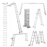 Versatile Configurations: This multi-purpose aluminum extension ladder transforms into a scaffold, leaning ladder, or stepladder, offering seven different formations to meet diverse height and working requirements. Robust Construction: Constructed from heavy-duty aircraft-grade aluminum with square rungs and supporting tubes, ensuring stability and durability, and meeting the EN 131 standard. Secure Locking System: Features a "click & Lock" system with six security locks, allowing for easy and secure shape changes while maintaining user safety. Enhanced Safety Features: Incorporates zigzag anti-slip foot straps to prevent sliding and undulating ridges on square rungs to minimize foot slippage during use. Compact Storage: Folds down to a compact size of 60.2" x 9.8" x 23.6" for convenient storage and easy portability. High Load Capacity: Designed to support a maximum load capacity of 330 lb, suitable for various home and business applications.