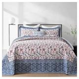 Oversized Queen Bedspread 102"x120" - 100% Cotton Super King Quilt, Vintage Floral Pattern, Extra Large Lightweight Reversible Quilted Bedspread Coverlet, 3 Pcs, Blue/Red